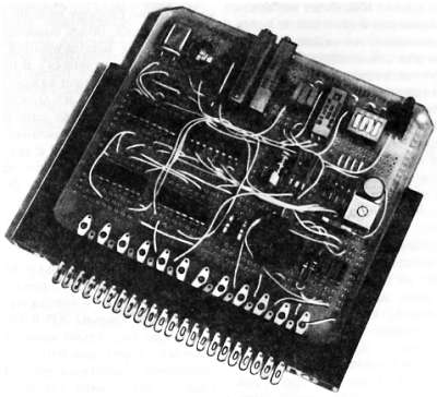 Рис. 12.1. Плата «самолет» для макетирования пайкой, широко используемая при монтаже небольших схем, особенно содержащих как дискретные элементы, так и ИМС. Такая плата приспособлена для монтажа 12 ИМС в двухрядных (DIP) корпусах. Она имеет шины разводки заземления и питания. Металлизированный печатный разъем стандартизован, поэтому плата может вставляться в общий каркас или разъем с обоймой, как показано на рисунке. В данной схеме помимо транзистора и ИМС содержатся различные компоненты: одно- и многооборотные подстроечные индуктивности, потенциометры, кварцевый резонатор, размещенные в корпусе DIP ключи, миниатюрные реле и световой индикатор логических состояний.