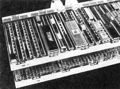 Конфигурации разъемов в некоторой степени стандартизированы. Чаще других распространены платы с 22 контактами на каждой стороне с шагом 3,9 мм (бывают также и 3,2 и 2,5 мм). Разъем, соответствующий такой плате, называется двусторонним 44-контактным печатным разъемом. Платы-макеты могут быть различных размеров и вмещают от 12 до 36 и более ИМС. Несколько большей совместимостью с конструкциями компьютеров обладают платы, рассчитанные на 100 или более ИМС. Такие платы могут непосредственно использоваться в головном образце небольшой вычислительной машины. Некоторые из этих плат — с односторонней печатью, другие — с двусторонней, со сквозными отверстиями. Этот вопрос еще будет обсуждаться ниже в связи с обычно используемыми ПС. На рис. 12.1 приведена фотография небольшой платы-макета печатной схемы (Douglas Electronics 11-DE-3), вставляемой в 44-контактное двустороннее гнездо и встраиваемой в рамку с направляющими (Elco 6022), поддерживающими платы ПС.