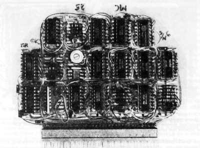 Рис. 12.4. Платы с соединениями накруткой обеспечивают точный и быстрый монтаж, особенно они хороши для схем с цифровыми ИМС. Эта плата сделана по образцу печатной схемы, штырьки для соединения накруткой вынесены на компонентную сторону в отличие от обычного расположения штырьков на нижней стороне. Такая специфическая компоновка платы диктуется внутренними габаритами океанографического датчика давления, для которого она предназначена.
