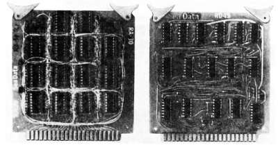 Рис. 12.3. Большая панель с монтажем «накруткой» и ее нижняя сторона (вид в зеркале). Проволочный монтаж микрокомпьютерной схемы выполнен машинным способом (см. разд. 12.08. «САПР/АСУП»). На этой универсальной панели размещены чипы разных размеров, переходники-держатели элементов, а также участки для подсоединения внешних плат с помощью ленточных кабелей с двухрядными 14 штырьковыми разъемами.