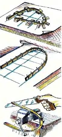 Скелет этого ящера лучше сделать из бамбука. Но для этого нужны определенные навыки, да и материал высокого качества и без узелков. Поэтому используйте обычный шпон. На большой доске или плите ДСП начертите каркас в натуральную величину и набейте по линиям первый ряд тонких гвоздей. Затем расположите вдоль них полоски шпона, смазывая их клеем ПВА и скрепляя по ходу дела вторым рядом гвоздей. Так можно делать каркас переменной толщины. В отдельных, наиболее нагруженных, местах он может состоять из 5–6 слоев шпона. Однако для получения точной формы необходимо, чтобы нигде не было менее 2 слоев. После полного высыхания клея (6–8 часов) выньте гвозди и снимите готовый каркас.