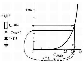 Начнем с примера. Допустим, вас интересует падение напряжения на диоде, представленном на рис. Е.1. Предположим, что вам известна вольт-амперная характеристика используемого диода (конечно, существует некоторый технологический разброс, а также сказывается влияние температуры окружающей среды): пусть она имеет такой вид, как показано на графике. Как определить положение точки покоя? Один метод заключается в том, что нужно грубо задать величину тока, скажем 0,6 мА, затем с помощью вольт-амперной характеристики определить падение напряжения на резисторе, затем на основании этого результата определить новую величину тока (в данном случае 0,48 мА). Этот итеративный метод иллюстрирует рис. Е.1. После нескольких итераций вы получите ответ, который, правда, оставляет желать лучшего.