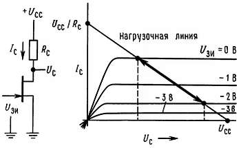 Выходное напряжение для заданного входного сигнала можно получить, если спроектировать на ось напряжения отрезок нагрузочной линии, заключенный между точками ее пересечения с вольт-амперными характеристиками, соответствующими входному сигналу. На примере показано напряжение стока для изменения напряжения на затворе (входного) от значения потенциала земли до —2 В.