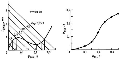 Отметим, что в данном случае роль питающего напряжения играет напряжение Uвх. Изменение сигнала от пика до пика порождает семейство параллельных нагрузочных линий, пересекающихся с вольт-амперной характеристикой элемента (рис. Е.5, а). Приведенные значения соответствуют сопротивлению 100 Ом для резисторов нагрузки. Как следует из графика, выходной сигнал быстрее всего изменяется, когда нагрузочная линия пересекает участок отрицательного сопротивления на характеристике диода. Значения Uвых (представляющие собой проекцию на ось х), соответствующие различным значениям Uвх (отдельные нагрузочные линии), образуют представленную в этом же примере передаточную характеристику. Рассматриваемая схема обеспечивает некоторое усиление по напряжению для входных напряжений вблизи значения 0,2 В.