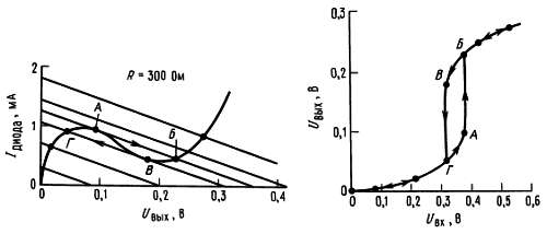 Интересное явление наблюдается в том случае, когда нагрузочные линии становятся более пологими, чем средняя часть характеристики диода. При этом сопротивление нагрузки превышает абсолютную величину отрицательного сопротивления диода и возможны две точки пересечения с характеристикой диода, как на рис. Е.6. По мере того как растет выходной сигнал, нагрузочные линии поднимаются до тех пор, пока точка пересечения не переходит скачком к более высокому значению Uвых. При изменении в обратном направлении точка пересечения аналогичным образом перемещается вниз до тех пор, пока скачком не возвратится обратно. Полная передаточная характеристика, как видим, обладает гистерезисом. Это явление позволяет использовать туннельные диоды в качестве быстродействующих переключательных элементов (триггеров).