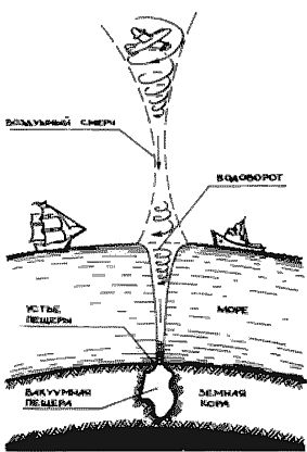 Несколько похожа на вышеописанную и гипотеза польского инженера-механика Е. Корхова. По его мнению в океанической коре могут образовываться герметичные пустоты или пещеры, возникающие из-за сжатия и расширения верхнего слоя Земли. При новых сдвигах и сотрясениях такая пещера может разрушиться и в нее устремляется вода. В результате этого образуется глубокий и необычайной силы водоворот, который засасывает к тому же и воздух. Так образуется "обратный смерч", который сможет засосать в океан судно или самолет (рис. 9).
