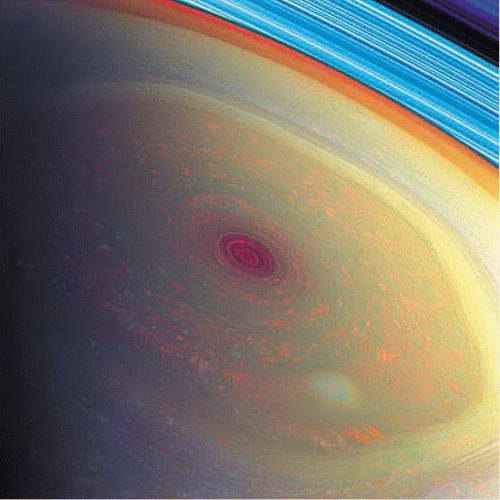 На северном полюсе Сатурна хорошо видна устойчивая облачная структура в виде правильного шестиугольника — гексагена