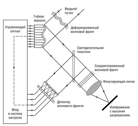 Принципы адаптивной оптики. Запуск на орбиту в 1990 г. оптического телескопа «Хаббл» диаметром 2,4 м и его чрезвычайно эффективная работа в последующие годы доказали большие возможности телескопов, не обремененных атмосферными искажениями. Но высокая стоимость создания и эксплуатации космического телескопа заставила астрономов искать пути компенсации атмосферных помех у поверхности Земли. Появление быстродействующих компьютеров и, не в последнюю очередь, желание военных создать систему космического оружия с лазерами наземного базирования сделали актуальной работу по компенсации атмосферных искажений изображения в реальном времени. Система адаптивной оптики, выравнивая и стабилизируя фронт прошедшего сквозь атмосферу излучения, дает возможность не только получать в фокусе телескопа четкое изображение космического объекта, но и выводить с Земли в космос остро сфокусированный луч лазера. К счастью, военные устройства такого типа реализованы не были, но проделанная в этом направлении работа чрезвычайно помогла астрономам почти полностью реализовать теоретические параметры крупных телескопов по качеству изображения.