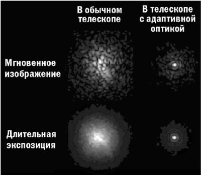 В принципе системы активной и адаптивной оптики подобны друг другу. Обе они содержат три основных элемента: 1) анализатор изображения, 2) компьютер с программой, вырабатывающей сигналы коррекции, и 3) исполняющие механизмы, изменяющие оптическую систему телескопа так, чтобы изображение стало «идеальным». Количественное различие между этими системами состоит в том, что коррекцию недостатков самого телескопа (активная оптика) можно проводить сравнительно редко – с интервалом от нескольких секунд до 1 минуты, но исправлять помехи, вносимые атмосферой (адаптивная оптика), необходимо значительно чаще – от нескольких десятков до нескольких тысяч раз в секунду. Ясно, что с такой высокой частотой система адаптивной оптики не может изменять форму массивного главного зеркала телескопа и вынуждена управлять формой специального дополнительного легкого и мягкого зеркала, установленного у выходного зрачка телескопа
