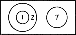 Счастливая идея, позволяющая сразу же решить головоломку проф. Квиббла, сводится к тому, что одни и те же монеты могут одновременно находиться более чем в одном стакане. На языке теории множеств решение задачи допускает следующее описание: имеется два множества монет, одно из которых содержит 7 элементов, а другое — 3 элемента, причем в последнем множестве выделено подмножество, содержащее 1 элемент. Наглядно полученное решение можно изобразить в виде следующей диаграммы:
