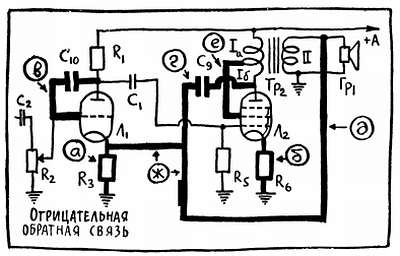 На рис. 50 вы видите упрощенную по сравнению с предыдущей (не показаны цепи накала, вместо пентода в первом каскаде работает триод) схему усилителя НЧ, где жирными линиями показано несколько типичных цепей отрицательной обратной связи. Прежде всего (а, б) напряжение обратной связи появится на катодных сопротивлениях R3 и R6, если отключить от них конденсаторы. Теперь под действием анодного тока на сопротивлениях возникает не только постоянное, но и переменное напряжение, которое, как всегда, действует между катодом и корпусом, а значит, между катодом и сеткой.