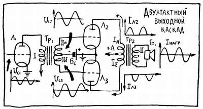 Возможен такой режим двухтактного каскада, когда лампы работают поочередно, подобно кенотронам в двухполупериодном выпрямителе. Правда, в двухполупериодном выпрямителе нагрузку включают так, чтобы получить в ней пульсирующий ток, то есть ток одного направления. В двухтактном каскаде задача совсем другая — лампы должны создать в нагрузке переменный ток, причем каждая из них обеспечивает какой-нибудь одни — положительный или отрицательный полупериод этого тока. Из каждой половинки обмотки энергия передается во вторичную, где выходные мощности обеих ламп суммируются в едином переменном токе низкой частоты.