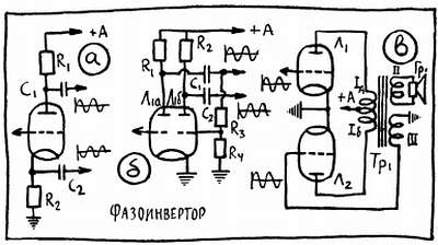 Глазные из них — малые нелинейные искажения при большой выходной мощности, уменьшение габаритов выходного трансформатора, экономный расход анодного тока, возможность улучшить частотную характеристику. Благодаря этим достоинствам двухтактная схема, наверное, применялась бы еще более широко, не будь у нее так велики запросы. Она требует, чтобы на сетки ламп Л2 и Л3 подавались одинаковые по величине и обязательно противофазные напряжения — когда на одной сетке положительный полупериод усиливаемого сигнала, на другой должен быть отрицательный. Для того чтобы получить такие напряжения, как правило, используется специальный усилительный каскад с громоздким названием «фазоинвертор».