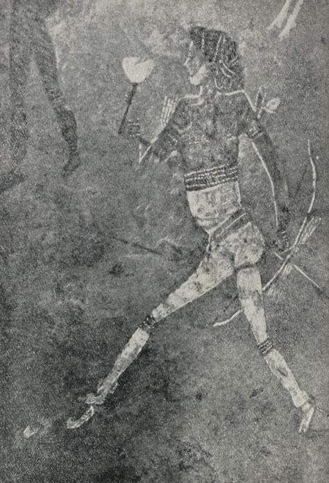 Аббату Брейлю к тому времени был уже семьдесят один год, но он не побоялся трудностей и одолел тяжелый трехкилометровый подъем по крутому склону скалистого ущелья Цисаб до пещеры Белой дамы. Он провел десять дней буквально у ее ног, старательно перерисовывая изображение со стены пещеры. Брейль все больше убеждался в правильности своего первоначального предположения. Белая дама Огненной горы с луком и стрелой очень живо напомнила ему древнегреческую Диану. Ее рыжие волосы были украшены жемчугом, в руке — белый цветок (изображения цветов ни разу до тех пор не встречались в бушменской росписи), под подбородком — белая лента, совсем как на древнеегипетских рисунках.