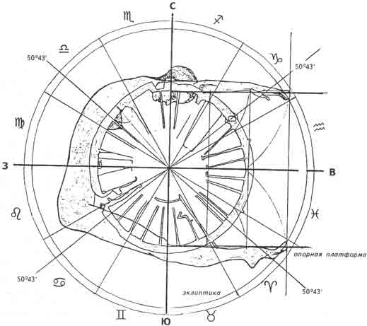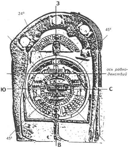 Богиня Нут поставлена на ступни, а не на кончики пальцев (на цыпочки), как в обычном случае. Особо интересно устройство Круга Земного. Здесь есть центральная площадь и переходная внутренняя зона. В верхней части кольца изображен вход в Дуат, его охраняет волк Упуат. Обратим внимание на границу этой части круга. Она суть прямая линия, проходящая по касательной к "границе площади" (траектории Полюса Мира). Эта линия есть фрагмент оси равноденствий астрометрической основы Аркаима. Как раз здесь находится и выход (вход) из Внутреннего Круга наружу. На египетском рельефе вход изображен как дверь. К сожалению, на приведенном рисунке не читаются детали в кольце границы площади (внутренняя буферная зона) или на траектории Полюса Мира. Там угадывается около 40 фигур и прямоугольник входа-выхода у точки касания. По классическим представлениям здесь запад. Отсюда можно предположить, что рисунок ориентирован так, что в верхней части запад, а в нижней, где платформы рук и ног, – восток.