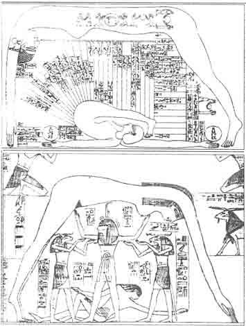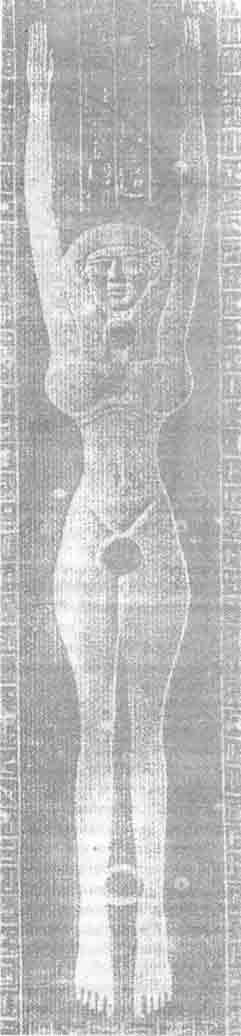 Древнеегипетское искусство знает много вариантов нашего космологического сюжета. Удивительно и необъяснимо в них разнообразие вычурных поз бога Земли (рис. 15). В других космологических сюжетах тоже встречается вычурная поза бога. Таков Озирис, оконтуривающий своим кольцеобразным телом загробный мир Дуат (рис. 16). Кроме дуговых Нут (различные варианты), известны изображения богини Неба на крышках саркофагов в линейной позе – вытянутой в струнку, с поднятыми вверх руками (рис. 17).