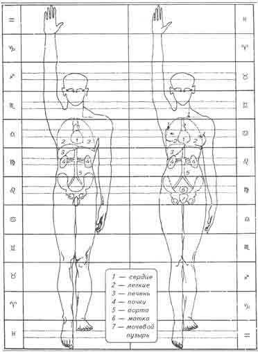 Внутренние органы и основные анатомические детали "расфасованы" внутри знаков в соответствии с их "золотыми сечениями". Гипотеза отрабатывалась на материалах анатомических атласов и антропологических учебников. Соответствие полное. Такое решение задачи о совершенном каноне имеет множество следствий. В анатомии, физиологии, медицине, в том числе восточной медицине (открывается понятный естественный смысл ее основ). Однако для нас более важны космологические следствия. Движение в эту сторону следует начать с установления простого правила: границы анатомического зодиака связаны с телом топологически, т.е. претерпевают пластические трансформации при перемене позы и движениях, при возрастных и патологических изменениях.