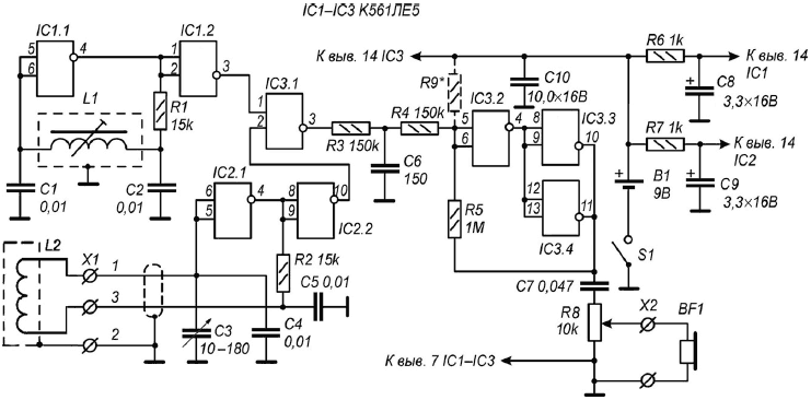 Следует признать, что помимо определенных достоинств (например простоты схемы, температурной стабилизации) такие конструкции имеют и ряд недостатков. Главным из них является возникновение паразитных связей между отдельными элементами внутри кристалла микросхемы, устранить которые практически невозможно. Именно поэтому в таких металлоискателях приходится выбирать частоту биений более 100–300 Гц, что неизбежно приводит к снижению его чувствительности.