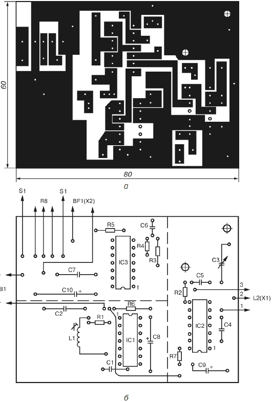 Все детали рассматриваемого металлоискателя (за исключением поисковой катушки L2, резистора R8, конденсатора С3, разъемов Х1 и Х2, а также выключателя S1) расположены на печатной плате размерами 80х60 мм, изготовленной из двустороннего фольгированного гетинакса или текстолита (рис. 3.7). При этом монтаж элементов выполняется со стороны проводников, а фольга с другой стороны играет роль экрана.