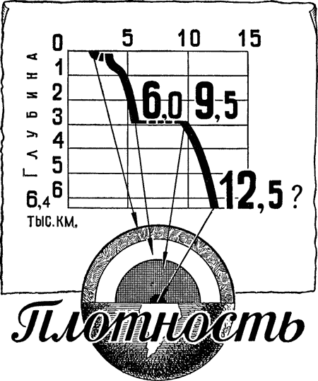 Как мы видели, плотность пород с глубиною растет, хотя и неравномерно. От 2,5 на поверхности она доходит до 3,4 на глубине около 100 км и до 6,0 на уровне 2900 км ниже поверхности. Здесь, на границе ядра, в величине плотности наблюдается скачок: она сразу достигает значения 9,5 (приблизительно), а далее снова растет равномерно, доходя в центре ядра до 12,5 (по М. С. Молоденскому, 1955) (см. рис. 8).