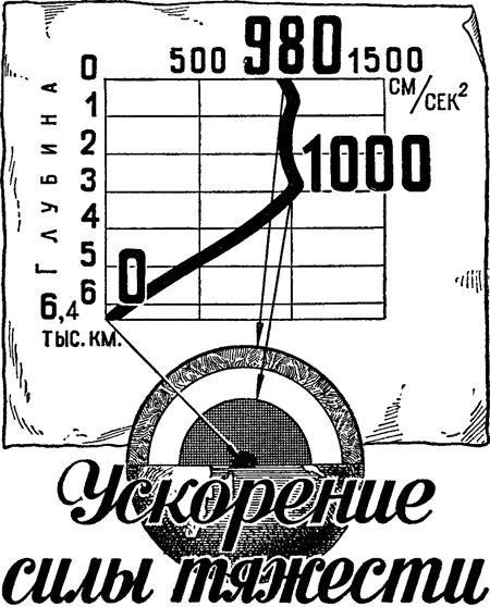 Что касается силы тяжести, то о ней можно сказать следующее. Сила тяжести — сила, с которой Земля притягивает к себе все тела. Под влиянием этой силы тела, находящиеся в свободном состоянии (например, в воздухе), падают на Землю, т. е. движутся по направлению к центру Земли, постепенно убыстряясь, т. е. получая «ускорение». Величину «ускорения силы тяжести» можно вычислить. На поверхности Земли ускорение силы тяжести равно приблизительно 9,8 м/сек2; в глубине Земли оно сначала немного возрастает, достигая максимума близ поверхности ядра, а затем быстро падает, доходя в центре Земли до нуля (рис. 9). Это понятно: точка, находящаяся в центре земного шара, притягивается всеми окружающими ее частями, с одинаковой силой по всем радиусам, а в итоге равнодействующая будет равна нулю.