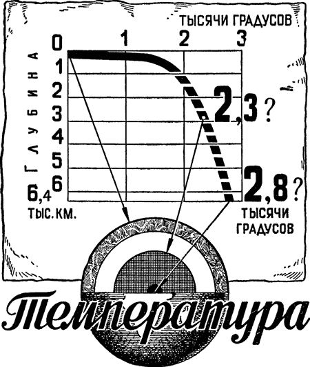 Перейдем к температуре. По данным измерений в буровых скважинах, а также в шахтах, выяснено, что с глубиной температура растет, поднимаясь приблизительно на 3° на протяжении каждых 100 метров. Подобный темп роста температуры сохраняется всюду, на всех материках, но лишь в наружных частях Земли, близ самой ее поверхности. С глубиной величина «геотермического градиента» (геотермический градиент — изменение температуры в градусах на каждый сантиметр) падает. Вычисления, основанные на учете теплопроводности горных пород, показывают, что геотермический градиент, известный для наружных частей земного шара, сохраняется не далее, чем на протяжении первых 20 км; ниже рост температуры заметно замедляется. У подошвы сиалической оболочки вряд ли температура будет выше 900°; на глубине 100 км — около 1500°; дальше рост ее еще более замедляется. Что касается центральных частей Земли, в частности ядра, то с достоверностью о них оказать что-либо очень трудно. Специалисты, изучавшие этот вопрос, полагают, что недра Земли нагреты не выше, чем на 2–3 тысячи градусов (рис. 11).
