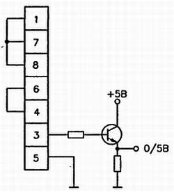 Простая схема для согласования ТТЛ устройств (с уровнями сигналов 0/5 В) со стандартом RS232 показана на рис. 2.36. Она содержит оптопару с двумя присоединенными к ней резисторами и обеспечивает полную гальваническую развязку между входом и выходом. Оптопара выполняет роль управляемого выключателя, который при зажигании светодиода входным сигналом соединяет последовательный вход интерфейса с источником напряжения 12 В, подключенным к одному из неиспользованных контактов разъема DB9 или DB25.