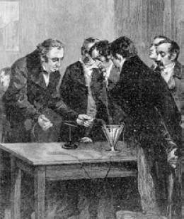 Сегодня, рассказывая о нагревании проволоки под действием протекающей в ней электрической жидкости, профессор Эрстед подошел к столу, чтобы показать опыт. Он хотел подключить к полюсам вольтова столба платиновую проволочку и дать желающим потрогать, чтобы убедиться в том, что она стала горячей. В те времена подобный результат вызывал настоящий восторг очевидцев.