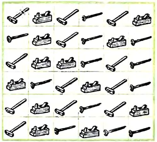 Сосчитай все рубанки, молотки, гвозди, оглядев рисунки лишь один раз. Считать нужно, начиная с верхней строки: первый молоток, первый рубанок, второй молоток и т. д.