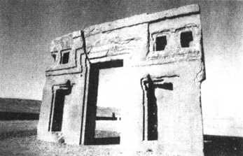 Тиауанако: Врата Солнца, вид с запада. Они вырублены из одного куска твердого андезита и весят свыше 10 тонн.