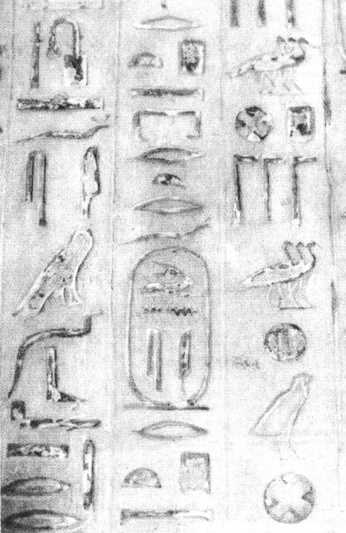 Деталь Текста Пирамид в погребальной камере Унаса в Саккаре. Имя Унаса написано в овальном картуше в центре фото. Тексты повествуют о судьбе усопшего фараона, душе которого предстоит возродиться в созвездии Ориона, и содержат странные намеки технического характера.