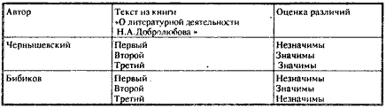 Из книги «О литературной деятельности Н. А. Добролюбова» были взяты в случайном порядке три отрывка. Каждый из этих текстов сравнивался с «усредненными» текстами Чернышевского и Бибикова. Результат анализа для наглядности представлен в виде таблицы.