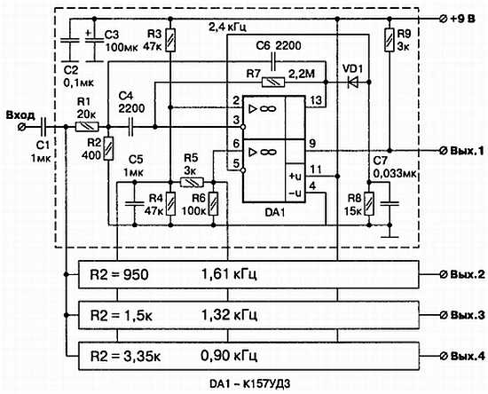 В качестве частотно-избирательных элементов таких дешифраторов долгое время использовались колебательные контуры. Поскольку для шифрации команд используются низкие частоты, катушки индуктивности выполнялись на броневых ферритовых сердечниках и имели значительные размеры и вес. Применение активных полосовых фильтров на базе операционных усилителей лишено указанных недостатков. Вариант такого дешифратора приведен на рис. 6.1.