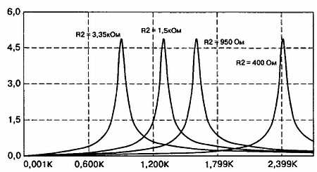 Частота настройки фильтра может регулироваться всего лишь одним элементом — резистором R2. Номиналы этого резистора для выбранных ранее частот (раздел 2.2.1) указаны на схеме. АЧХ фильтров для указанных номиналов изображены на рис. 6.2.