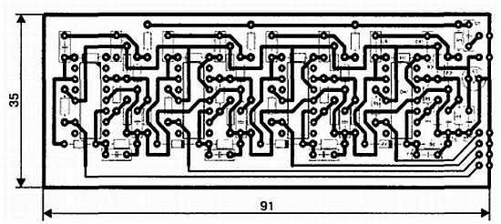 На рис. 6.3 приведен возможный вариант печатной платы. Полезно иметь ввиду, что коэффициент передачи фильтра около 50, поэтому необходимо обеспечивать, входной сигнал не более 100 мВ.
