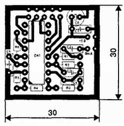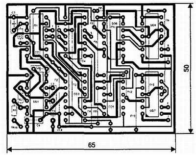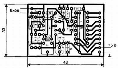 Соотношение величин резисторов R1, R2 определяет величину «гистерезиса» и чувствительность триггера. При указанных на схеме номиналах требуемая минимальная амплитуда входного сигнала составляет 4 В, а «гистерезис» — 1,5 В. Наладки дешифратор не требует. Печатная плата ввиду простоты ее разводки не приводится.