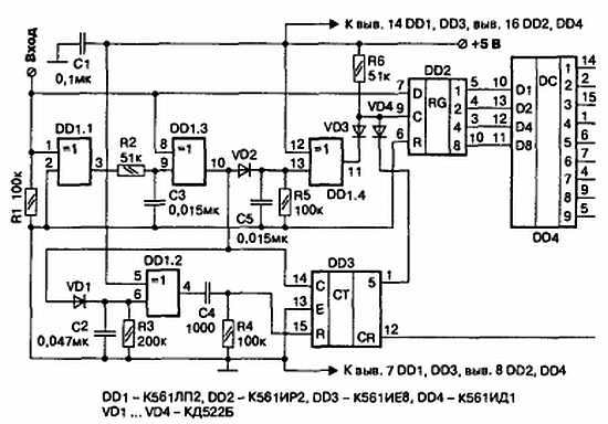 Если в пришедшей кодовой посылке в младшем разряде записана единица, то схема формирования импульсов записи вырабатывает один лишний импульс. Чтобы не происходило сдвига декодируемого числа на один лишний такт, прохождение пятого импульса записи на вход регистра блокируется схемой монтажного «И», собранной на элементах VD3, VD4, R6. Сигнал управления блокировкой формируется на выводе 1 элемента DD3 путем подсчета поступивших на вход импульсов записи.