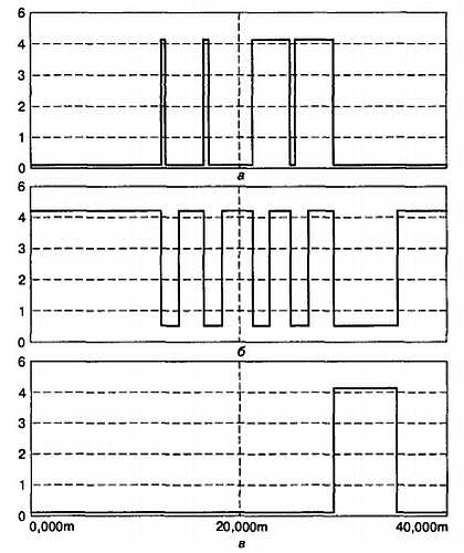 Сигнал с выхода приемника, имеющий вид, изображенный на рис. 6.7, a, поступает на вход дешифратора. Для примера закодировано число 3. На элементах DD1.1, DD1.3 собрана схема восстановления тактовых импульсов, которые, напомним, соответствуют по времени границам разрядных интервалов.