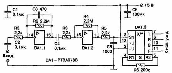 На элементах DA1.1, DA1.2 выполнен усилитель сигнала, обеспечивающий чувствительность схемы порядка 10–30 мВ, что обеспечивает возможность подключения дешифратора непосредственно к выходу, например сверхрегенеративного каскада. Выходные сигналы дешифратора имеют уровни КМОП-логики.