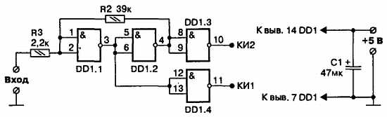 Для обеспечения работы дешифратора с положительными входными импульсами, элементы C1, R1, R2 необходимо подключить к выводу 3 микросхемы DAI, a R3, R4, С2 — к выводу 2. Величину резистора R3 при этом нужно уменьшить до 91 кОм.