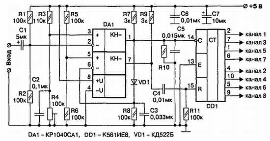 Сигнал с выхода приемника любого типа подается на вход дешифратора. Приведенный на рисунке вариант рассчитан на работу с отрицательными входными импульсами. Компаратор, собранный на верхней части микросхемы, обеспечивает формирование на своем выходе (вывод 1 DA1) положительных импульсов, длительность которых определяется длительностью принятых командных импульсов, а амплитуда практически равна напряжению питания схемы. Этот сигнал подается на счетный вход (вывод 14) канального распределителя, реализованного на микросхеме DD1.