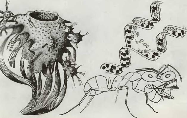 В природе немало примеров сложных колоний, способных на координированные действия и обладающих «разделением труда» между клетками. Это не только хорошо известная водоросль вольвокс, чьи сферические колонии плавают в воде, но и, например, миксобактерии. способные путешествовать посуху и выращивать из аморфной массы плодовые тела, напоминающие деревца. А еще – удивительные сушества. открытые в 1947 году русским микробиологом Б.В. Перфильевым, который назвал невиданного ранее монстра «хищной бактериальной сеткой» или диктиобактером. Эти существа захватывают микроорганизмы и переваривают их, действуя как своеобразный желудок. Но не следует сразу переходить к сенсационным обобщениям: «вот такой-то бактериальный желудок и был нашим предком»… Пока ясно одно: понятия «организм», «колония», «индивид», «группа» не имеют четких разграничений.