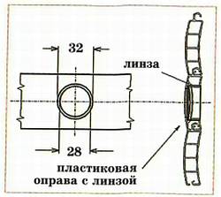 Один из вариантов креплений в пластиковой шторе очковой линзы в качестве объектива.