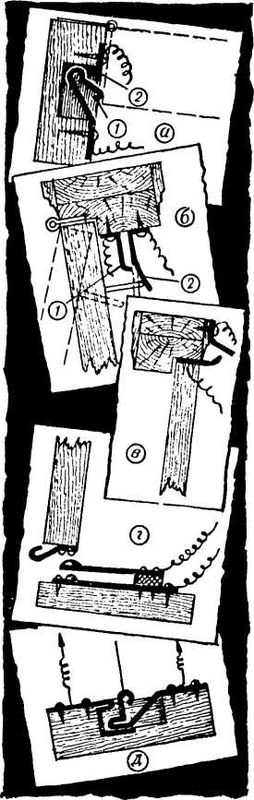 На рисунке 48 показаны некоторые варианты конструкции контактов «тайной» сигнализации. Их задача — замкнуть цепь сигнализации при открывании двери, окна, форточки, шкафа и проч.