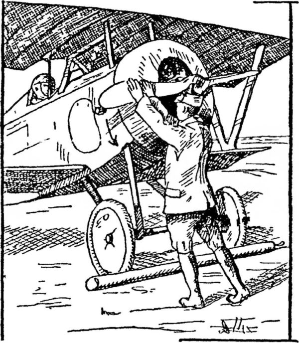Пока механик в последний раз осматривает — все ли в исправности, и заливает немного бензину в цилиндры мотора, летчик проверяет управление и приборы. Затем механик, взявшись за лопасть винта, несколько раз провертывает вал мотора, чтобы поршни в цилиндрах задвигались и залитый в них бензин хорошо бы смешался с воздухом, всасываемым через впускные клапаны. Затем механик спрашивает летчика: