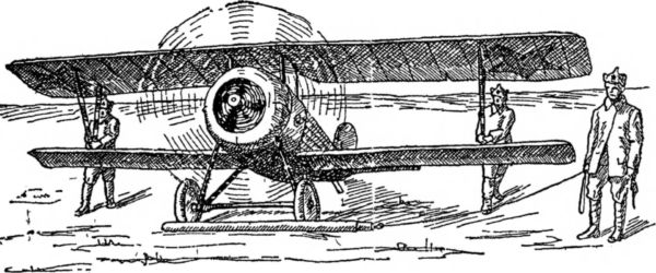 Когда самолет выведен из ангара (ангаром называется помещение, где хранится самолет), то летчик садится на свое место, а механик приступает к запуску мотора. Летчик привязывается к сидению широким ремнем (на всякий случай). Под колеса машины подкладываются деревянные козелки, которые должны удержать самолет при пробе мотора на месте (рис. 28).