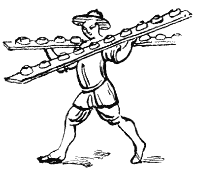 Вдруг толпа расступилась, и стало тише. Прохожие отошли в стороны. Появился рабочий с двумя длинными досками на плечах. На узких досках лежали в ряд белые матовые чашки донышками кверху. Это токарь нес свой хрупкий товар в обжигательную печь. Все давали ему дорогу, зная, что если хоть одна чашка разобьется, ему придется платить за нее хозяину. Он шел, легко ступая ногами в соломенных сандалиях и чуть-чуть покачиваясь на ходу.