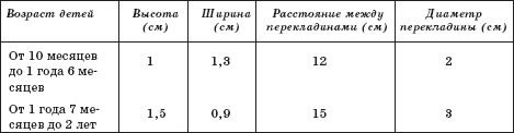 4. Ребристая доска длиной 1,5 м; состоит из 2 досок шириной 15 см. Доски скреплены между собой в трех местах подвижными петлями так, чтобы можно было ставить их под углом друг к другу. Каждая доска пересекается рядом поперечных закругленных перекладин. Высота каждой перекладины 1,5 см. Расстояние между перекладинами 2,5 см. 5. Круглый или обычный табурет высотой 32–35 см.