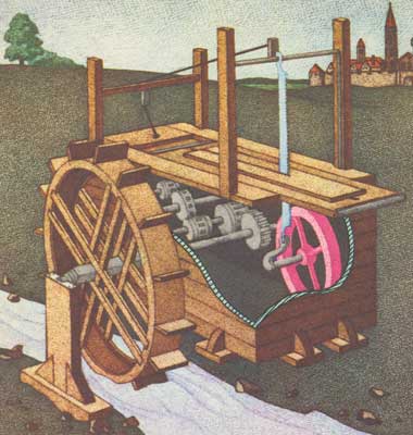 Даже тогда, когда машины стали приводить в движение с помощью водяного колеса, маховик не утратил своего значения. В XVI веке, например, его использовали в машинах для распиловки досок. Поднимать пилу вверх было легко: в это время она не пилила – наклон зубьев был в другую сторону. Опускать же оказывалось совсем непросто. Ведь при этом и происходила собственно распиловка доски. Без маховика пила бы часто застревала в доске, и водяное колесо не в силах было бы протянуть ее дальше. Теперь же маховик, разгоняясь при свободном ходе пилы вверх, отдавал ей свою энергию при рабочем ходе вниз. Пила не застревала, и дело шло быстро. Маховик здесь был уже гораздо больше по размерам и массе, чем на ручных машинах, – мощность тут требовалась изрядная.