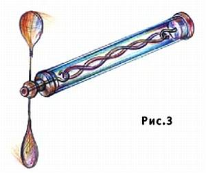 Для этого подойдет жесткая, прямолинейная, тонкостенная пластмассовая трубка диаметром 10–12 мм, применяемая для прокладки электропроводки (ее можно купить на любом рынке стройматериалов). В трубке размещается жгут из авиамодельной резинки. С одного конца он крепится к упорному крючку, с другого — к крючку вала пропеллера, сделанного из стальной проволоки диаметром 1,5–2 мм. Вал проходит через стальную шайбу и опорный подшипник. В простейшем случае роль подшипника может выполнять стеклянная бусинка. Им может послужить также бронзовая или латунная шайба бочкообразной формы, которую несложно выточить напильником, зажав в патроне электродрели.
